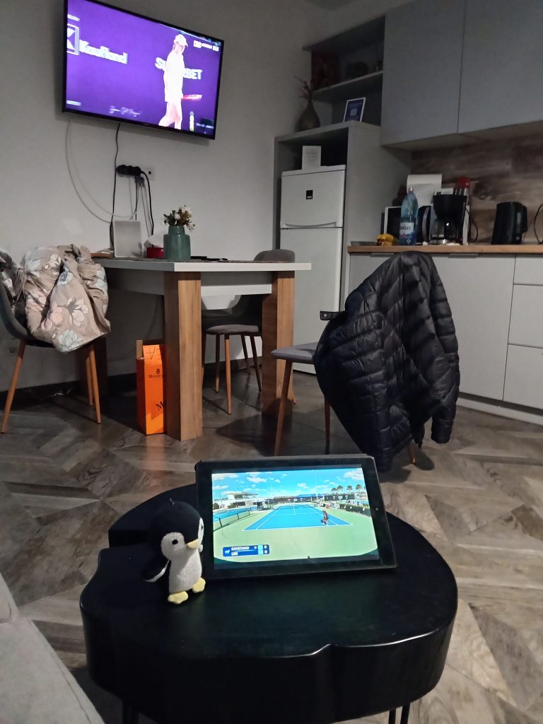 I return to the Tennis Bubble outside and ask them if they can put Gabi Lee’s match on, they refuse because she is nothing to do with the tournament, but that’s the tournament’s own fault and their loss. I return to my apartment to watch her with Emma Raducanu’s second round Cluj match on in the background. Gabi loses and it’s a sad ending to a phenomenonal evening with Sorana’s super Tennis. Cristina forgot to give her her some make up gifts from her business when she met her the other night but I was able to pass these on to Sorana after her win who was very grateful. She also has a life time achievement trophy, Positivity Penguin and copy of my tennis novel from me, what a great day for her.