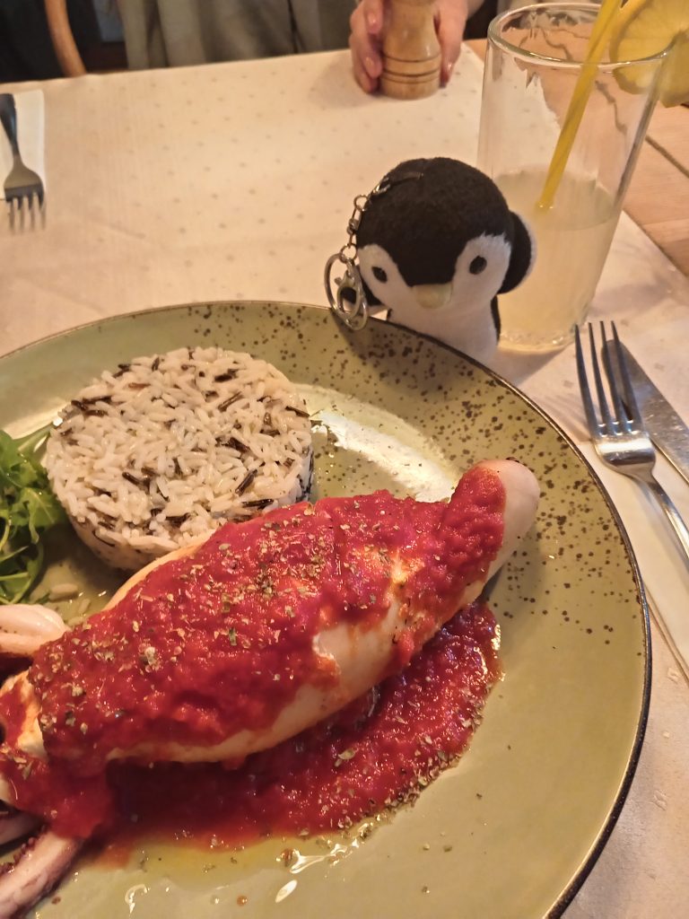 The rest of the day at the club is spent having a lovely chat with Tatiana Bojica, mother and coach of one of my other favourite young players, Stefania Bojica, who also deserved a gift of a Positivity Penguin. Stefi is practicing on the courts as Mummy Bojica and I sit on the bench and talk travel, tennis and council houses. It is now 4pm. Oana would like to meet for dinner at 730pm and my stomach still only has been treated to a crossiant. It’s too late for lunch and I do not want to spoil my meal. Mummy Bojica kindly gives me a large bread pretzel to munch on. I am grateful and it is very tasty. It starts to rain, gently at first then heavier. I make for the umbrellas over the tables at the club cafe where I find Adrian. Adrian and I stay at the club for a little longer and then walk to a sports bar before meeting Oana for dinner.