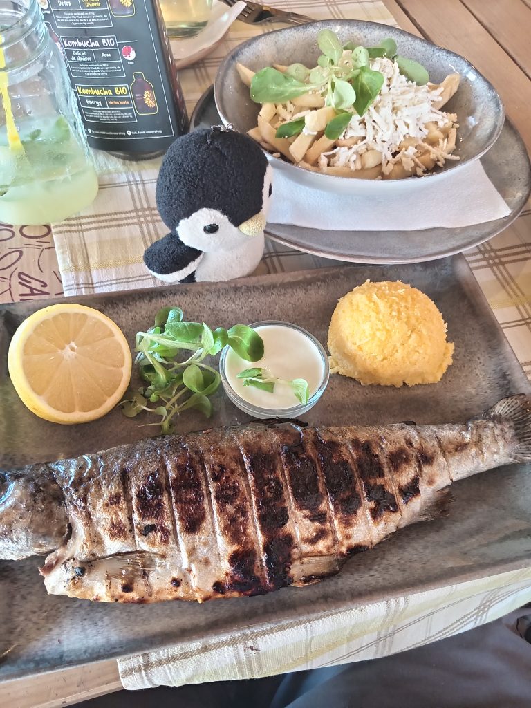 A very pleasant lunch in Bran after of grilled trout and of course mint lemonade. Adrian could not finish his vegetarian pizza as it was too filling, he gave me the last slice and he was correct. We Ubered back to the square and stopped for coffee before going to the club. We sat with Mummy Bojica in the players warm up area and I gave PP to Briana because I had been so impressed with her tennis this week. It was a little sad saying goodbye to him but Postivity Penguins have come and gone, PP 2 is still at home.