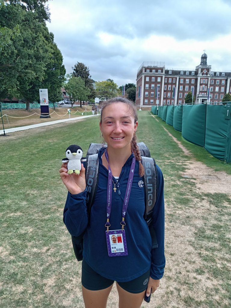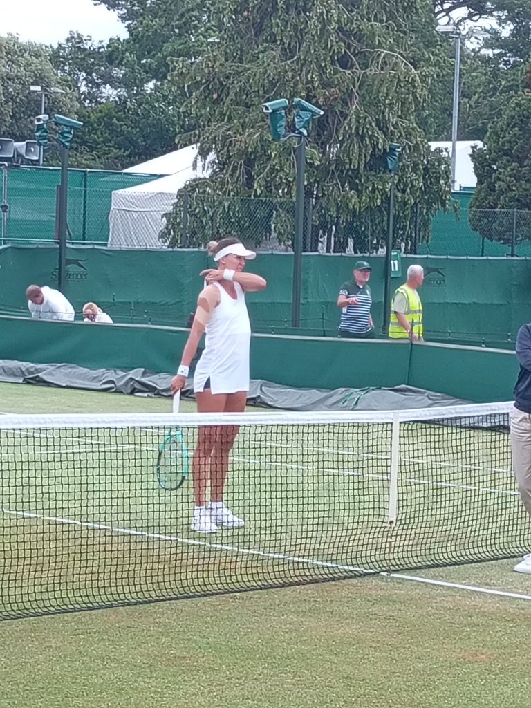 I return to Raluka’s match, she has won the first set and battles hard in a tight second. At 5-6 deuce it starts to rain and play is suspended. I carry my pained legs to the shelter of the marquee tent which everyone else is running towards. In the tent it is quite noisy but soon clear to me my interview with Leonie does not have very good sound quality unfortunately and may not be suitable for immediate upload but no point in panicking I just need to think of something. This time I do get a coffee and return to Raluka’s match. She survives the service hold on resumption of play after a few scares but loses a really tight tiebreak. She is broken early and then broken later again, her attitude is spot on throughout the whole Match however she just loses a little energy near the end but a great week for her.